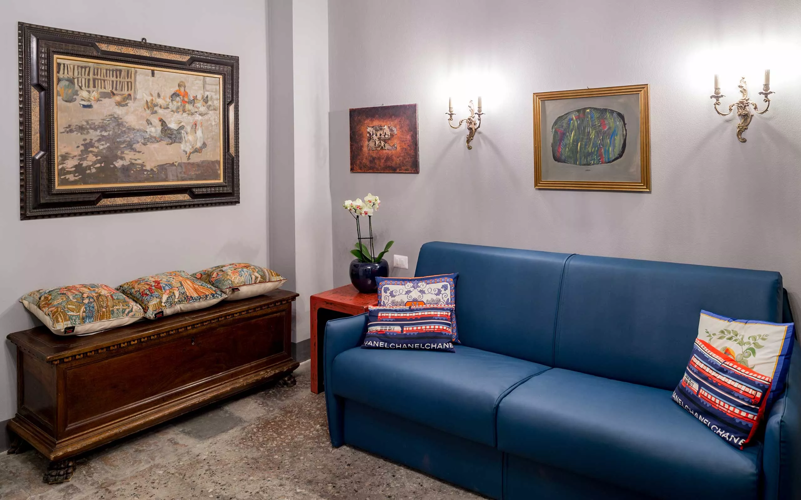 On the walls you can still see the soft colors of ancient paintings. Alongside design furnishings, you can find the déco bed, golden stools and antique chandeliers.