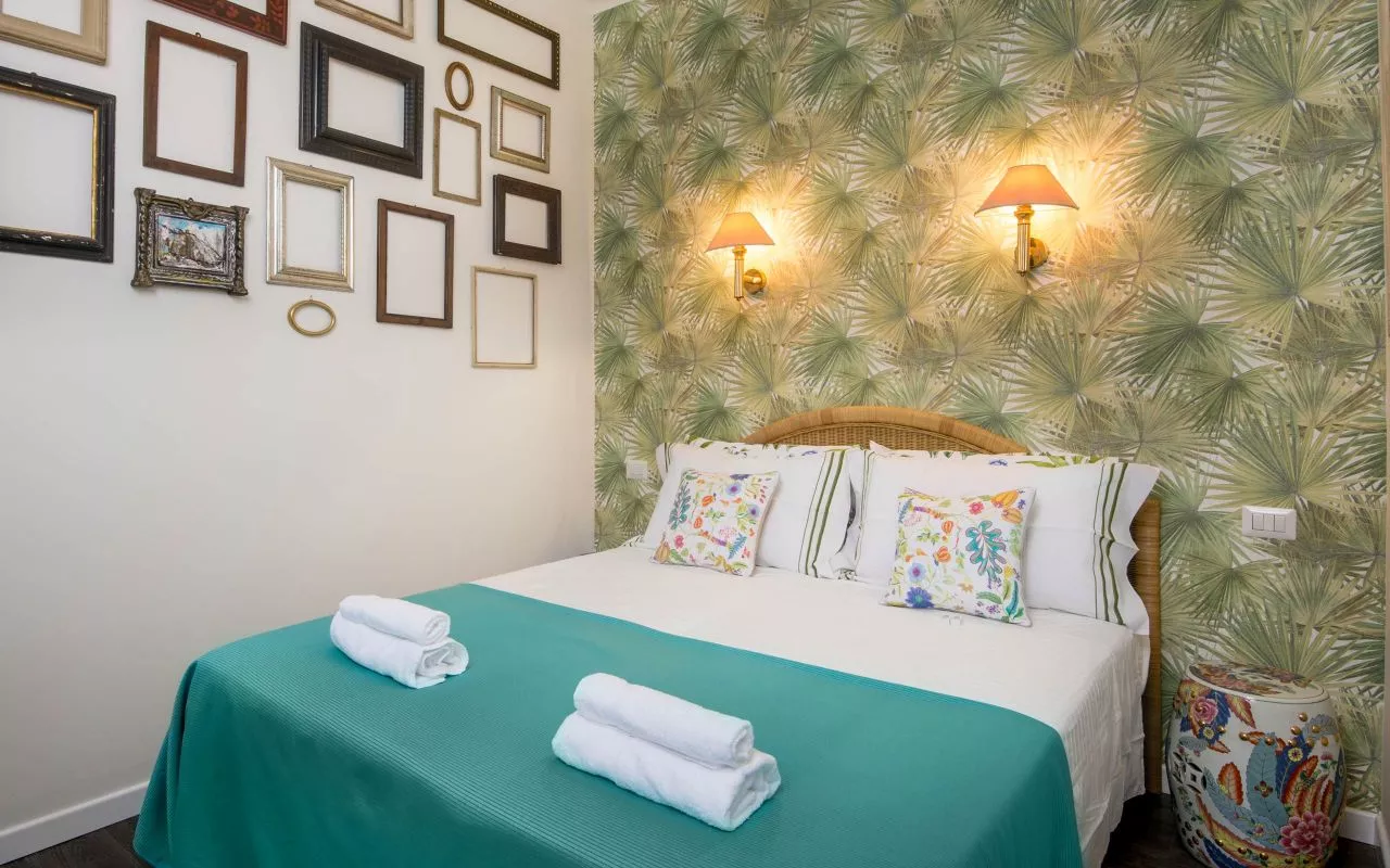 L’808 si differenzia per la terrazza piena di piante e fiori che si riflette in una camera “verde” e nell’arredo naturale, la parete decorata con carta da parati con grandi foglie di papiro che richiama molto lo stile jungle (anche grazie agli arredi in midollino).